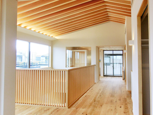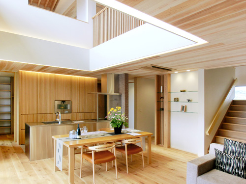 吹き抜けが部屋の上下をつなぎ、ふと見上げると無垢の構造材が安らぐ。