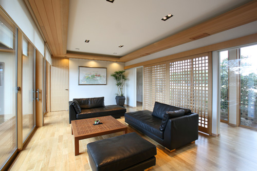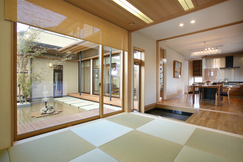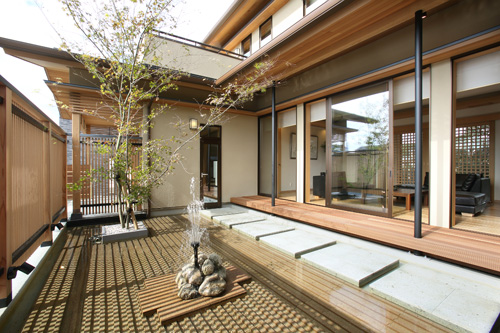 本格的な匠の和の住まいに、水の庭と石の庭。格子でプライバシーを確保した、ゆとりある空間。